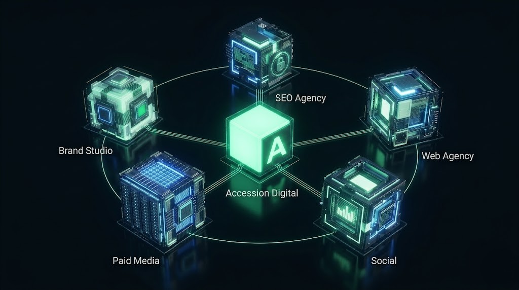 Most agencies are structured by channel — a web team, a social team, a paid media team. We're structured by outcome. One brief, one integrated system, one point of accountability. The difference shows in results that compound rather than results that stall when one channel underperforms.